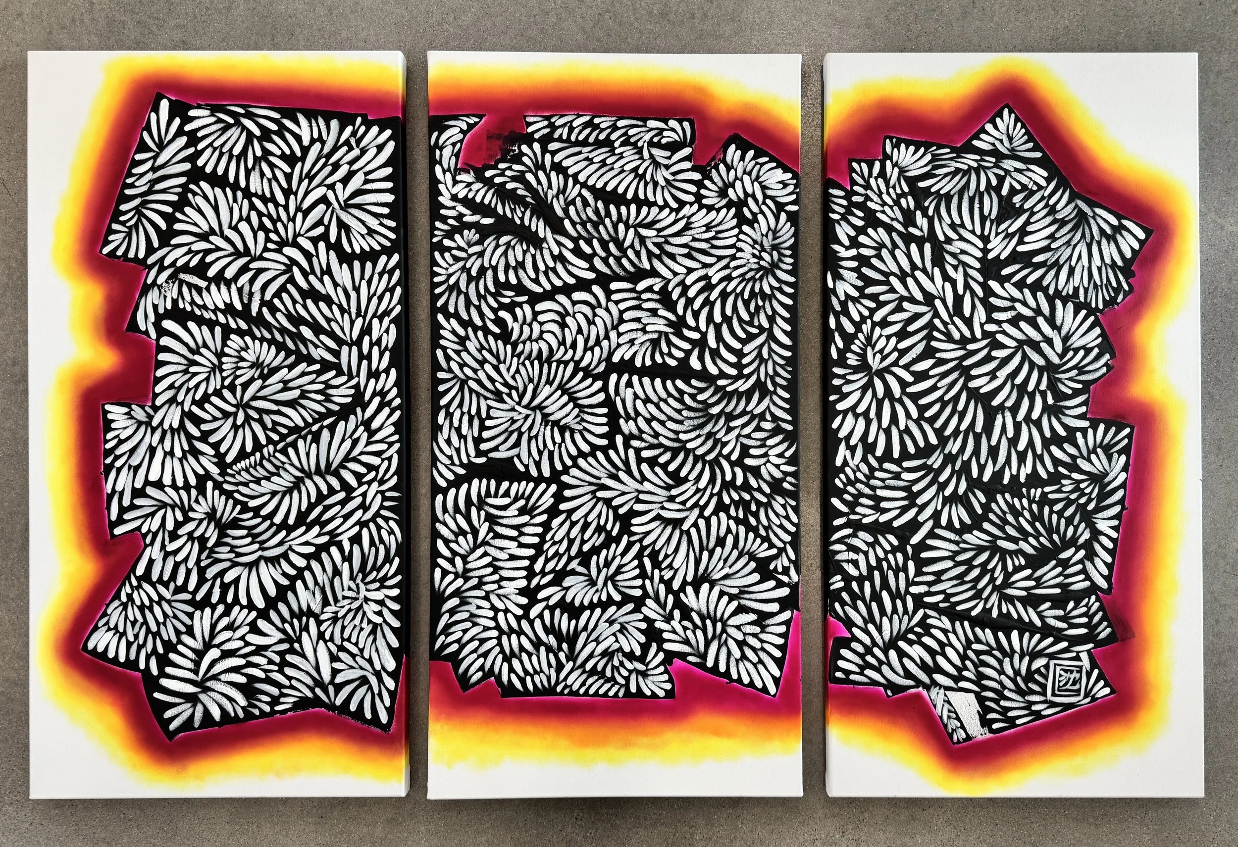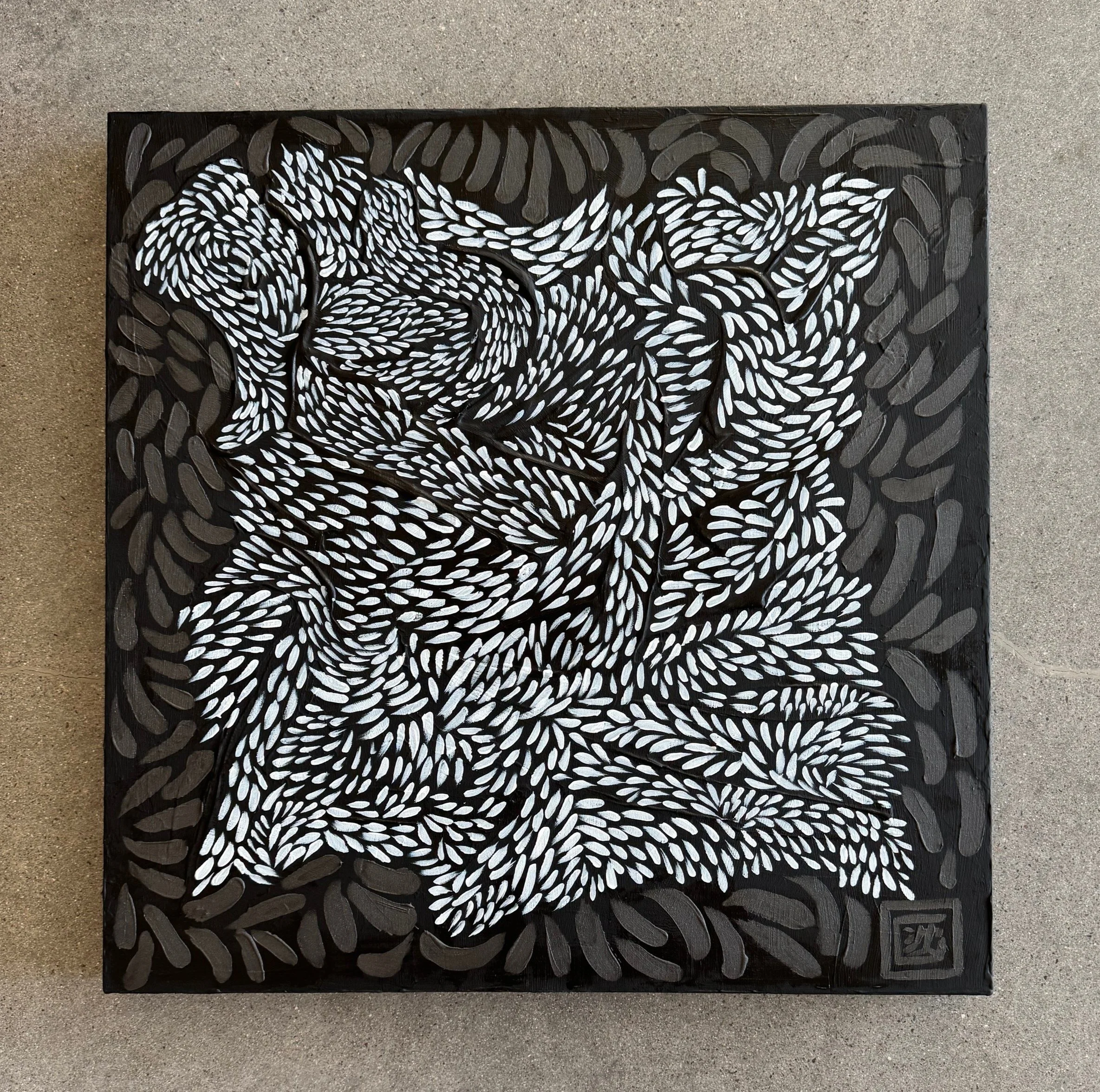 Acrylic, canvas, graphite, charcoal, custom wood frame.